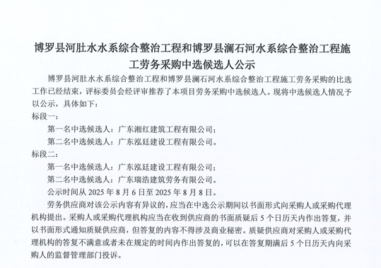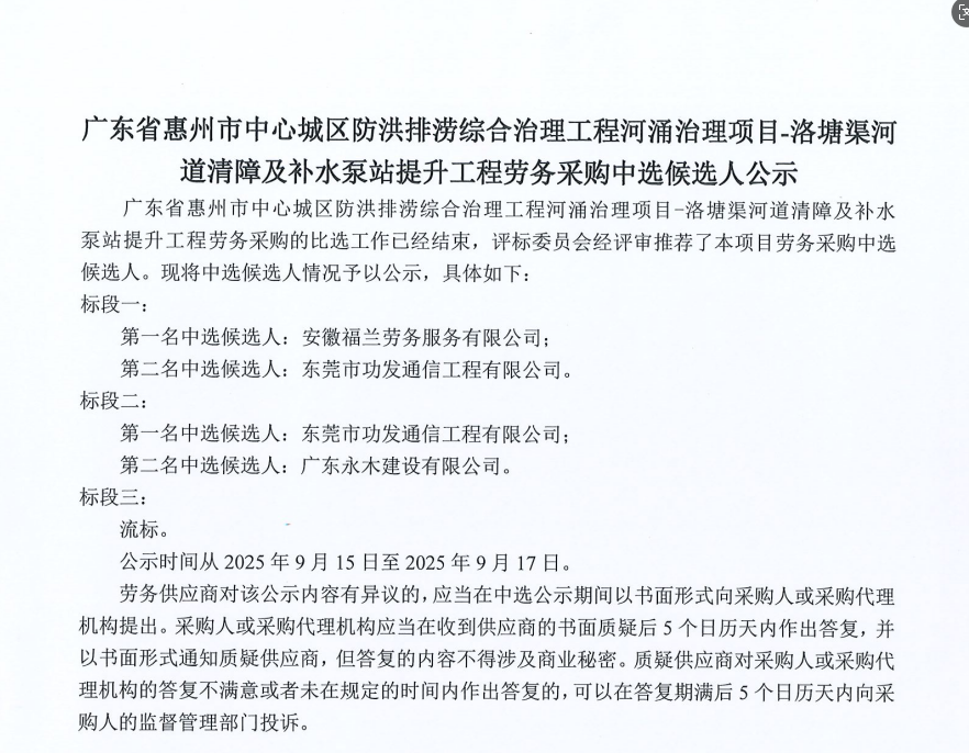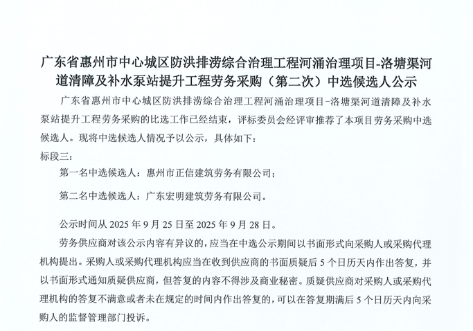廣東省惠州市中心城區防洪排澇綜合治理工程河涌治理項目-洛塘渠河道清障及補水泵站提升工程勞務采購(第二次)中選候選人公示……